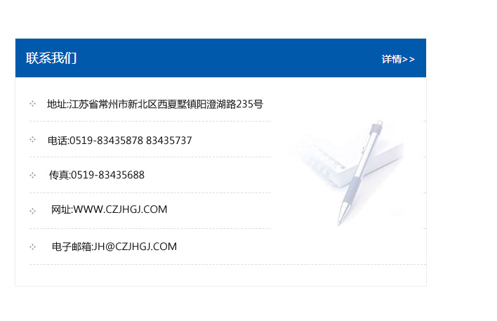 地址:常州市新北區友邦商務大廈1幢16、17層  電話:0519-85101652  傳真:0519-85112595  郵編:213022  網址:www_cz-jiayue_cn.petugongmo.com  郵箱:xiajifengaa@163.com